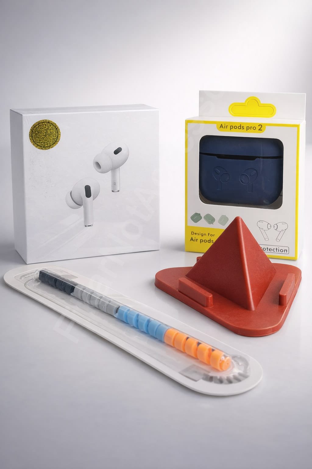 Upgrade your AirPods setup with this 4 in 1 AirPods Pro 2 Accessories Combo featuring wireless earbuds, a protective silicone case cover, a sturdy stand holder, and a durable cable protector. A complete solution for protection, organisation, and everyday convenience.